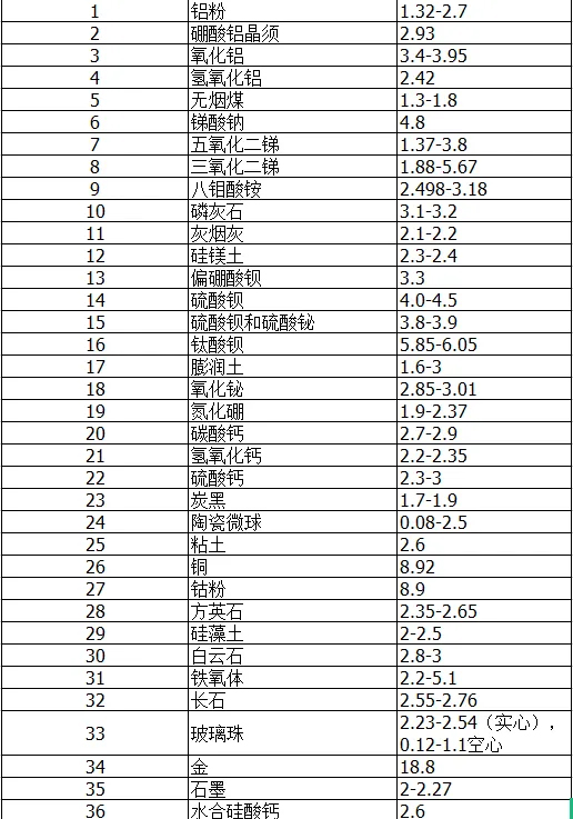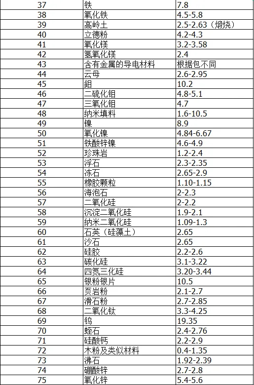 烟片、白皱片:0.98g/cm³ 硬脂酸:0.84g/cm³ 白蜡:0.9g/cm³ 松香:1.1g/cm³ 水泥:1.1g/cm³ 制作水泥:1.04g/cm³ 松煤焦油:1.04g/cm³ 黑油膏:1.08g/cm³ 白油膏:1.01g/cm³ 凡士林:0.88g/cm³ 磷酸氢钙:2.62g/cm³ 碳酸镁:2g/cm³ 陶土:2.6g/cm³ 石绵粉:2.5g/cm³ 锌钡白:4.15g/cm³ 硫酸钠钡:4.35g/cm³ 白云母粉:3g/cm³ 滑石粉:2.98g/cm³ 白艳华:2g/cm³ 硬性碳黑:1.8g/cm³ 硫磺粉:2.07g/cm³ 塑炼剂导热系数 硫黄粉:1.96-2.07g/cm³ VA-7:1.42-1.47g/cm³ DCP:1.082g/cm³ MOCA:1.39g/cm³ TDI:1.224g/cm³ TODI:1.197g/cm³ DMMDI:1.2g/cm³ PAPI:1.2g/cm³ DADI:1.2g/cm³ (注:塑炼剂类种较多,在这儿仅罗列部门比较普遍塑炼剂) 催进剂容重 SDC:1.30-1.37g/cm³ TP:1.09g/cm³ SPD:1.42g/cm³ CDD:1.70-1.78g/cm³ PZ(ZDMC):1.65-1.74g/cm³ EZ(ZDC):1.45-1.51g/cm³ BZ:1.18-1.24g/cm³ DBZ:1.14g/cm³ ZPD:1.55g/cm³ ZMPD:1.55-1.60g/cm³ (注:推动剂那个种类冗杂,此地仅例举部件常有推动剂) 化学活化剂容重 防氧化锌:5.6g/cm³ 碳酸锌:4.42g/cm³ 脱色镁:3.20-3.23g/cm³ 碳酸镁:2.19g/cm³ 氢钝化钙:2.24g/cm³ 一硫化铅:9.1-9.7g/cm³ 四防氧化三铅:8.3-9.2g/cm³ 碱式碳酸铅:6.5-6.8g/cm³ 硬脂酸:0.9g/cm³ (注:这儿硬脂酸也为抗逆性剂标出,但一般性也为涂料助剂在使用)家庭厨房电嚣橡胶制品圈皲裂 防老剂容重 AH:1.15-1.16g/cm³ AP:0.98g/cm³ AA:1.15g/cm³ BA:1.00-1.04g/cm³ RD:1.05g/cm³ (注:防老剂分类多样,在这儿仅介绍部门普遍防老剂)厨卫电器硅橡胶件制作 阻燃剂强度 机械性油:0.91-0.93g/cm³ 化工凡士林:0.88-0.89g/cm³ 石蜡:0.9g/cm³ 微晶石蜡:0.89-0.94g/cm³ 油气沥表:1.0-1.15g/cm³ 固体颗粒古马隆:1.05-1.10g/cm³ 松烟焦油:1.01-1.06g/cm³ DBP:1.045g/cm³ DOP:0.986g/cm³ (注:阻燃剂分类较多,彼处仅举出有些分类阻燃剂)厨卫产品垫圈图片文字高清晰度 特点严正声明:项目来源于 胶技術网 未经许可考生,以传递数据一些消息而也不是投资收益。著作权人包括进行漫画作品的创作家。如果侵权商标,请链接刪除。